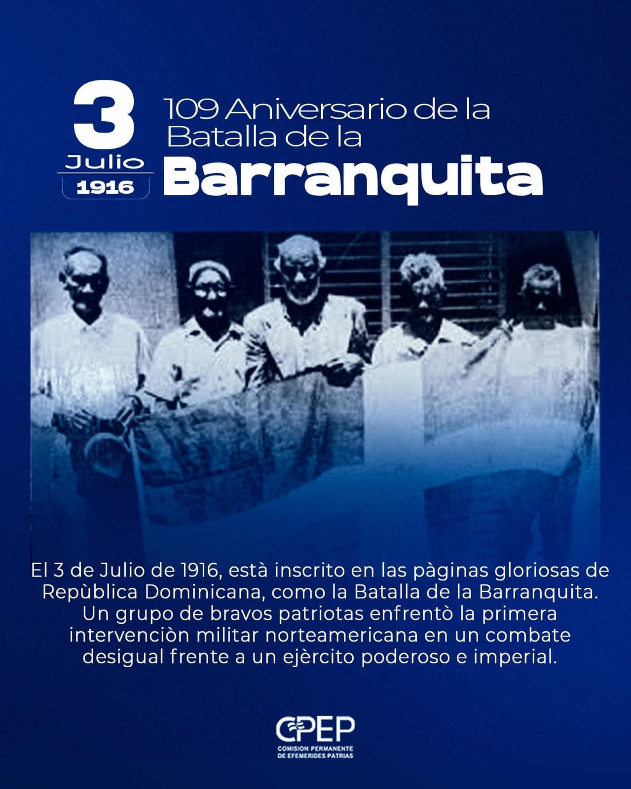 Hoy, al conmemorar el 3 de julio de 1916, elevamos nuestra memoria histórica y gratitud eterna, hacia aquellos valientes adalides dominicanos que, en los campos de la Barranquita, escribieron con coraje, determinación y sangre una página trascendente en la historia de la Patria.