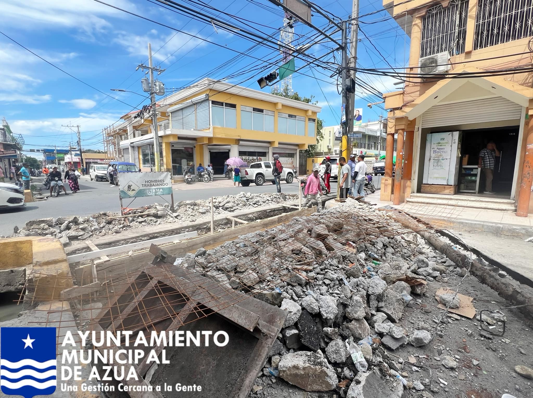 En la tarde de hoy se procedió con el vaciado del badén, en la calle Miguel Ángel Garrido con Emilio Prud’Homme, frente al Supermercado JYM, en Azua, esto para rehacer y acomodar ese bache hacia el Mercado Público.