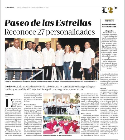 Acto de reconocimiento a Personalidades locales y nacionales en el Parque Duarte de Azua, ocupa espacio en importante periódico del País.