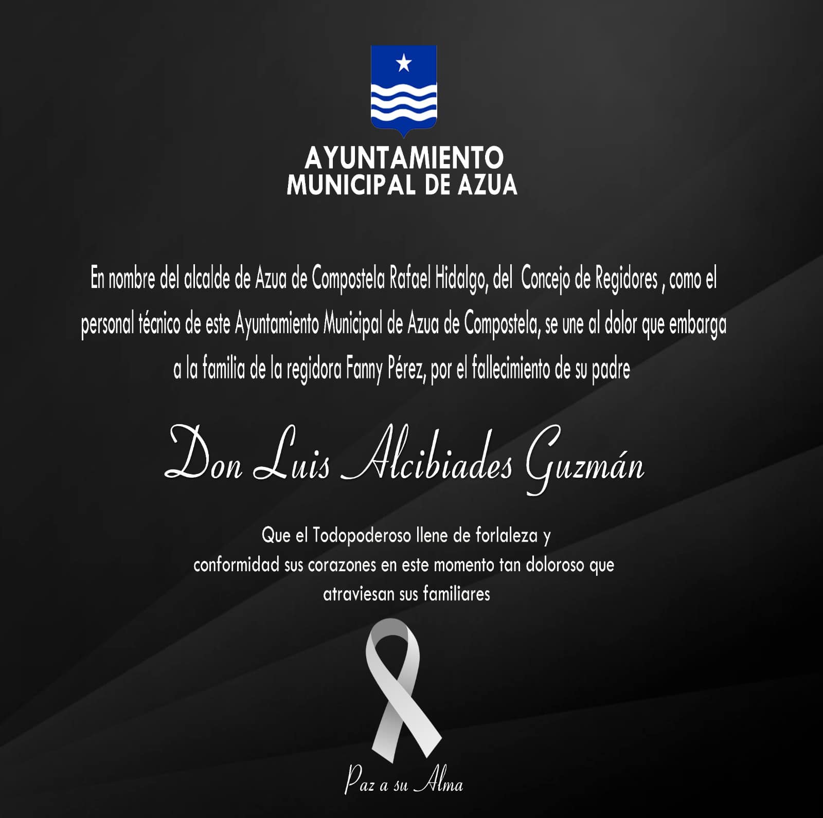 En nombre del alcalde de Azua de Compostela Rafael Hidalgo, del Concejo de Regidores, como el personal técnico de este Ayuntamiento Municipal de Azua de Compostela, se une al dolor que embarga a la familia de la regidora Fanny Pérez, por el fallecimiento de su padre Don Luis Alcibíades Guzmán.