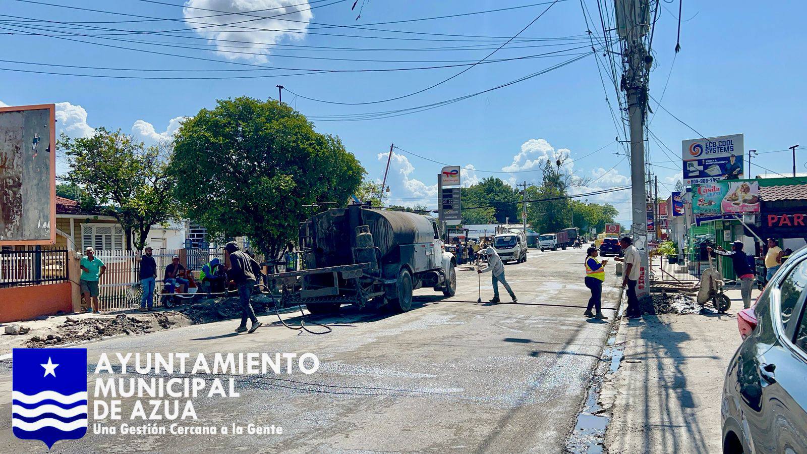 El Ayuntamiento Municipal de Azua de Compostela, a través del Departamento de Planeamiento Urbano, trabaja intensamente en la rehabilitación de la Avenida Sánchez, retirando escombros en los alrededores de la estación de gasolina Los Lámparas para dejar el tramo completamente habilitado y listo para el asfaltado.