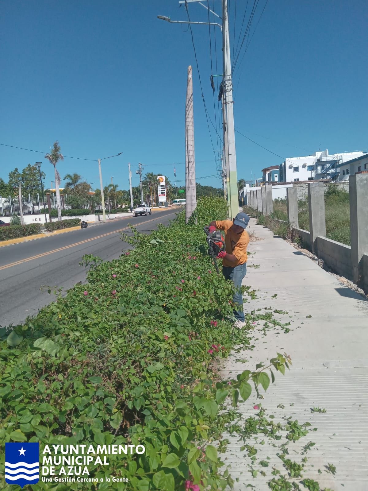 La brigada de Medio Ambiente del Ayuntamiento Municipal de Azua, bajo la dirección del alcalde Rafael Hidalgo, continúa sus esfuerzos para mantener en óptimas condiciones las áreas verdes del municipio. En la jornada de hoy, se realizaron labores de poda y adecuación en la jardinera ubicada en la entrada de la ciudad, un punto clave que da la bienvenida a residentes y visitantes.