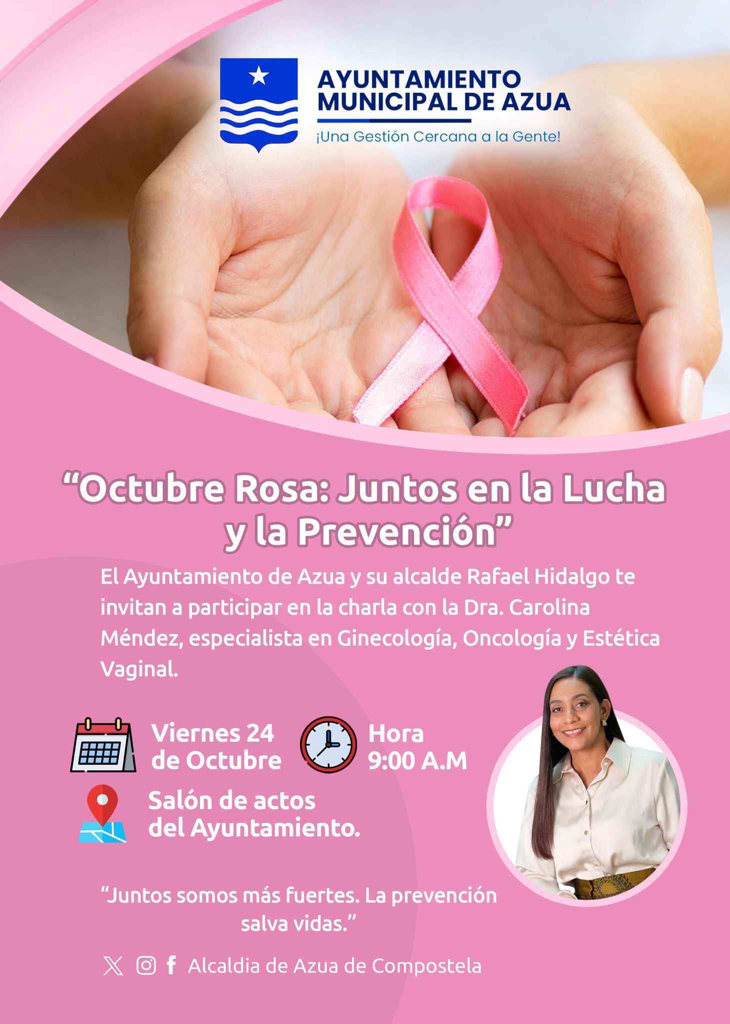 El Ayuntamiento Municipal de Azua, encabezado por el alcalde Rafael Hidalgo, invita a toda la ciudadanía a participar en una charla especial con motivo de Octubre Rosa, mes dedicado a la concienciación y prevención del cáncer de mama. La actividad se llevará a cabo este viernes 24 de octubre, a las 9:00 de la mañana, en el Salón de Actos del ayuntamiento.