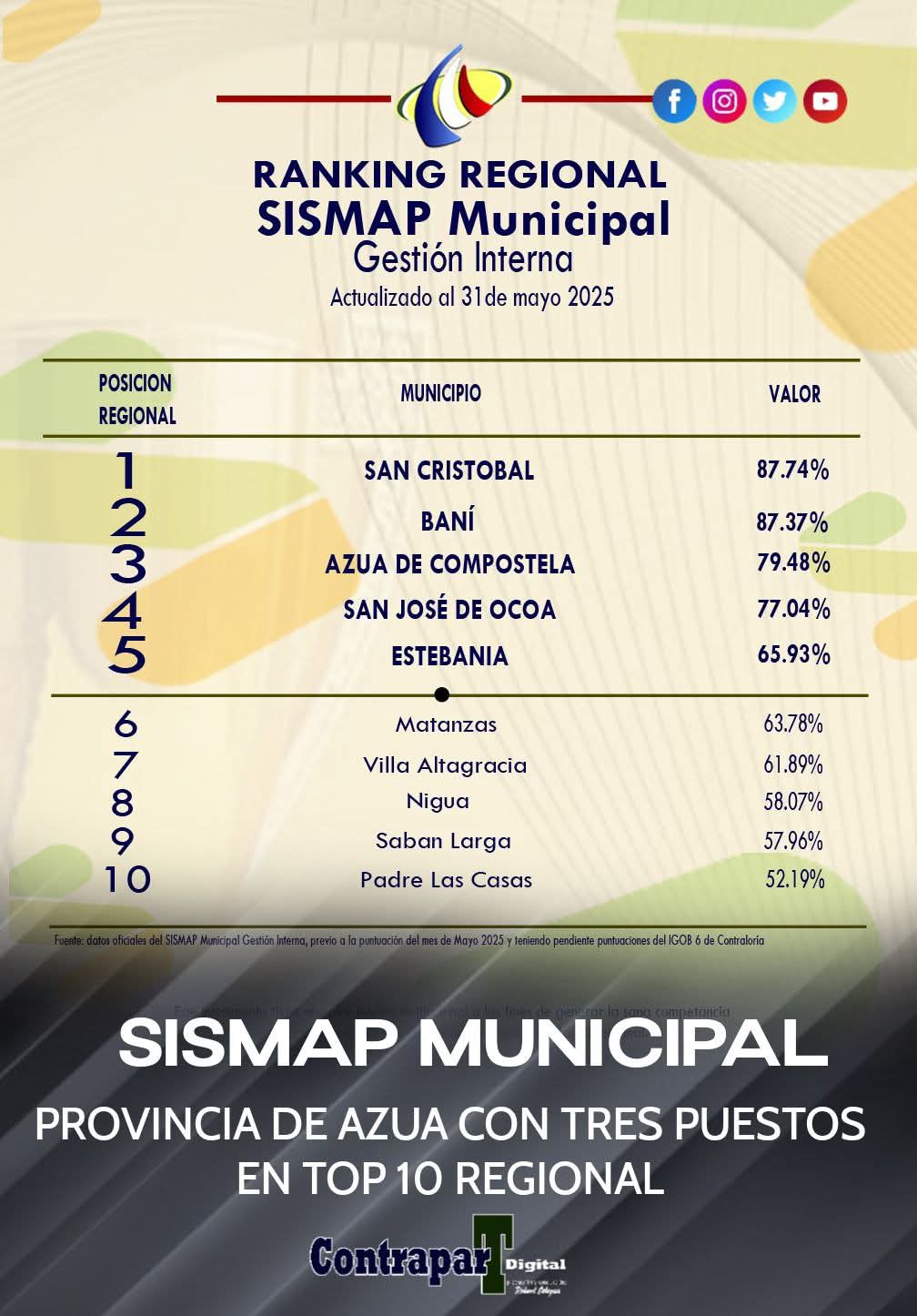 Tres municipios azuanos están en el Top 10 Regional del ranking de Gestión Interna al corte del 31 de mayo 2025: