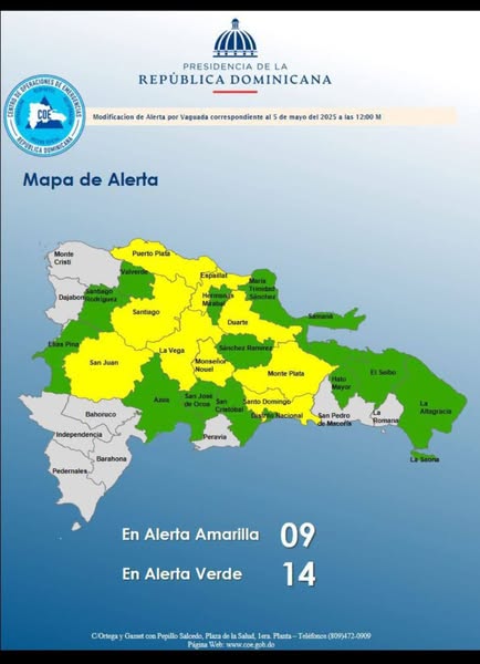 El Centro de Operaciones de Emergencias (COE) ha emitido una alerta verde para la provincia de Azua debido a posibles condiciones climáticas adversas que podrían afectar a la población en las próximas horas.