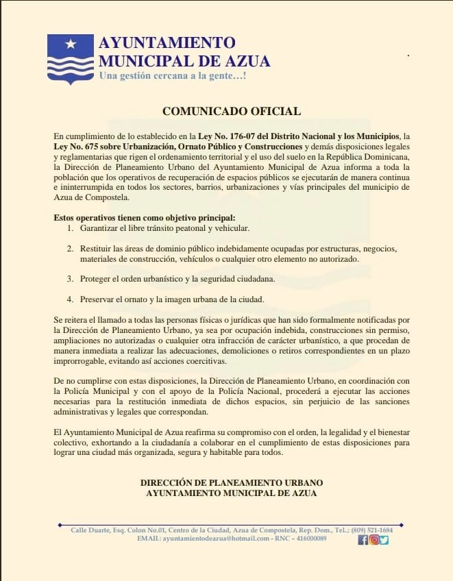 El Departamento de Planeamiento Urbano del Ayuntamiento Municipal de Azua informó que se mantendrán los operativos de recuperación de espacios públicos en diferentes puntos de la ciudad, como parte de las acciones destinadas a garantizar el libre tránsito vehicular y peatonal.
