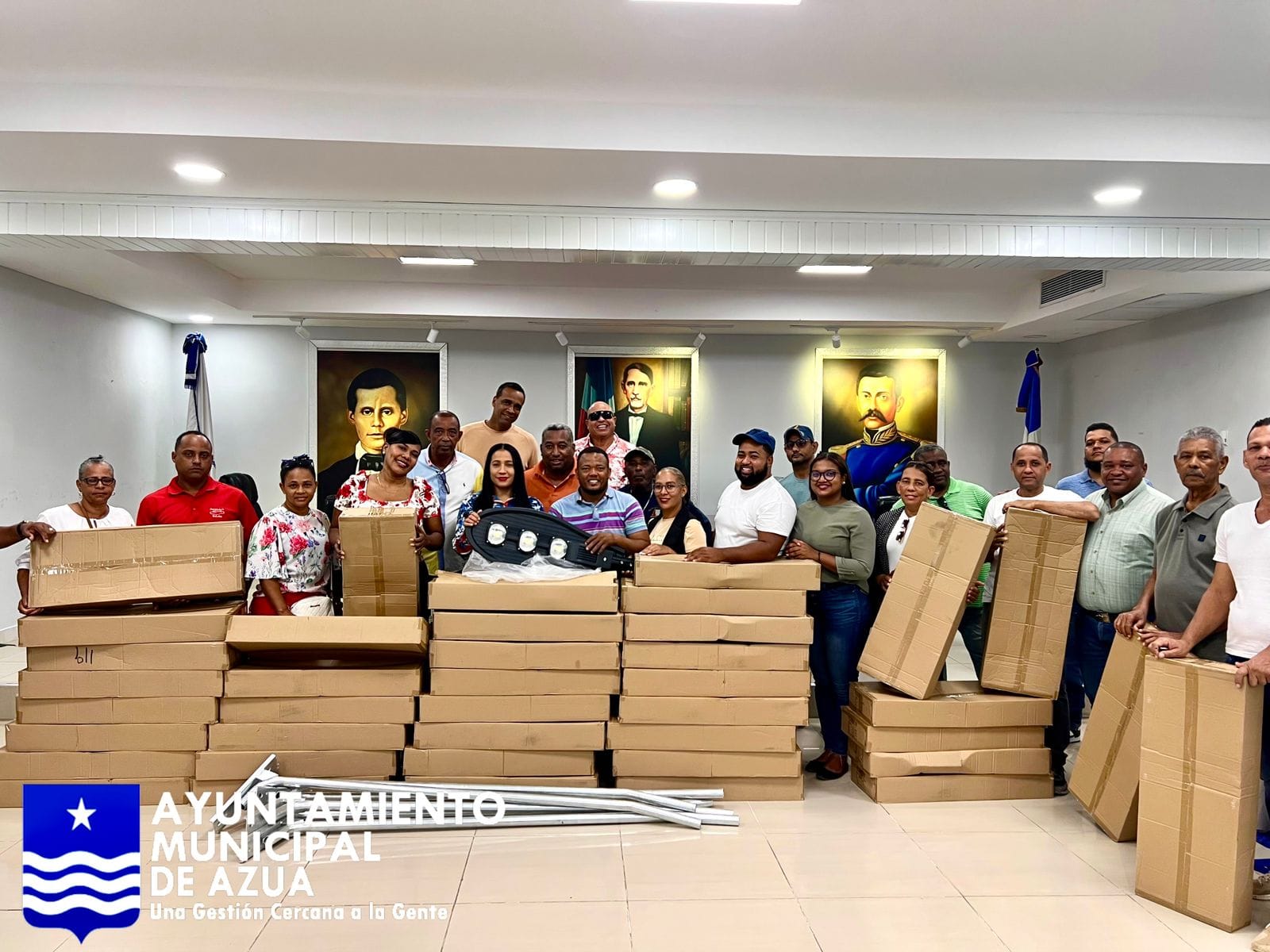 El Ayuntamiento Municipal de Azua realizó la entrega de 40 lámparas este viernes por la tarde a la comisión de Juntas de Vecinos, como parte de una primera partida. Se anunció que próximamente se efectuará una segunda entrega destinada a las juntas restantes.