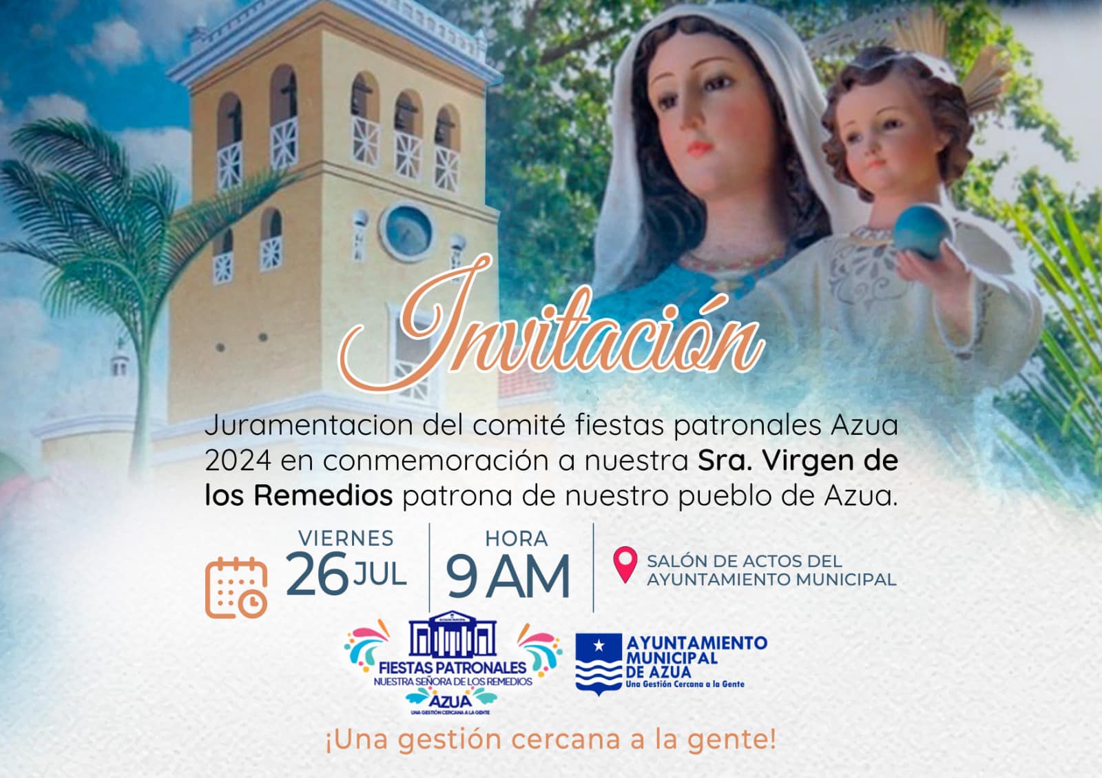 El Comité de las Fiestas Patronales Azua 2024, tiene el honor de invitarles a su juramentación este viernes 26 de julio, a las 10:00 am, en el salón de actos de la Alcaldía Municipal.
