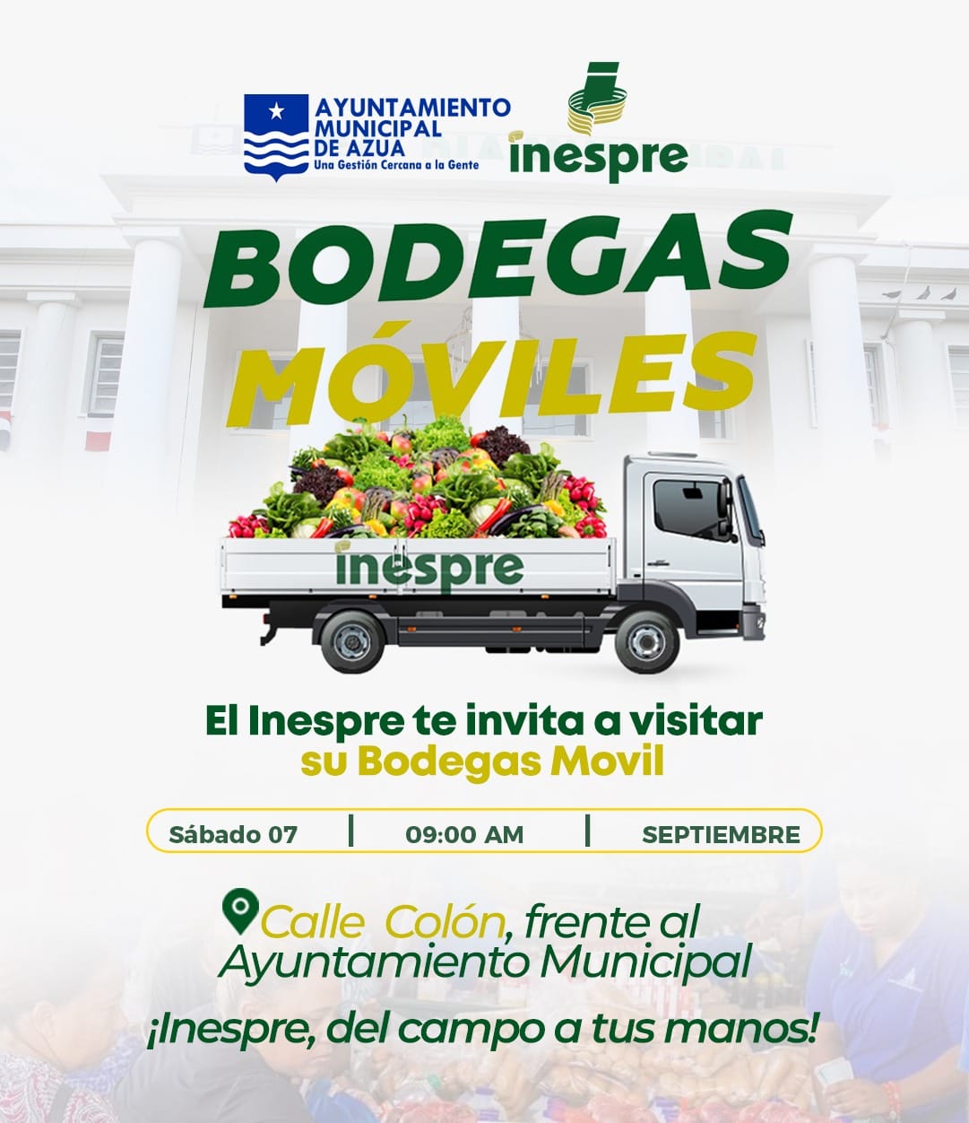 Por motivo de las Fiestas Patronales Azua 2024, mañana sábado desde las 9 de la mañana estará el Inespre com su Patana Móvil para el servicio de toda la población en la calle Colón, frente al Ayuntamiento Municipal de Azua (AMA).