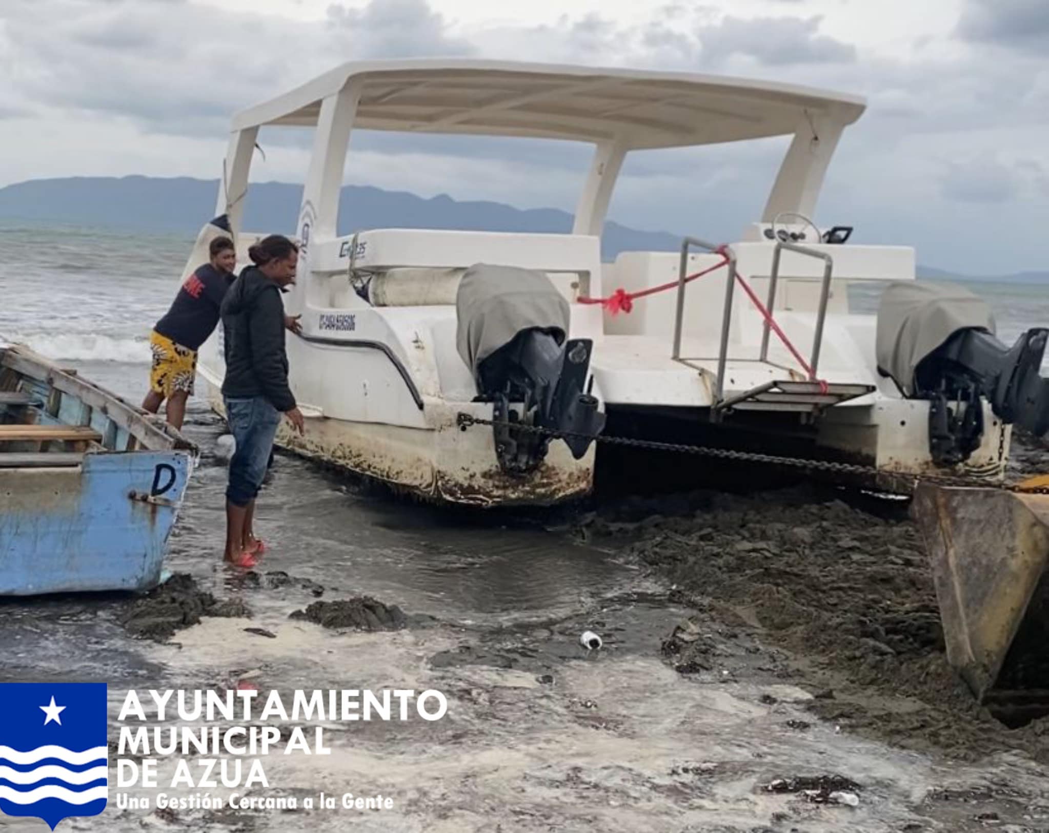 La Alcaldía Municipal de Azua, buscando salvaguardar los equipos del municipio con un grupo de colaboradores y una pala mecánica fue sacado del agua el Catamarán en playa Tortuguero, para que no sufra daños que puedan provocar los efectos del Huracán Beryl.