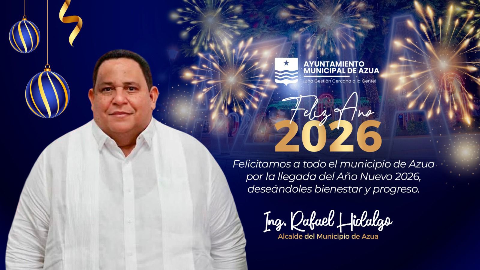 El alcalde Rafael Hidalgo envía un afectuoso saludo y sus más sinceras felicitaciones a toda la población de Azua, deseándoles un feliz, próspero y bendecido Año Nuevo 2026.