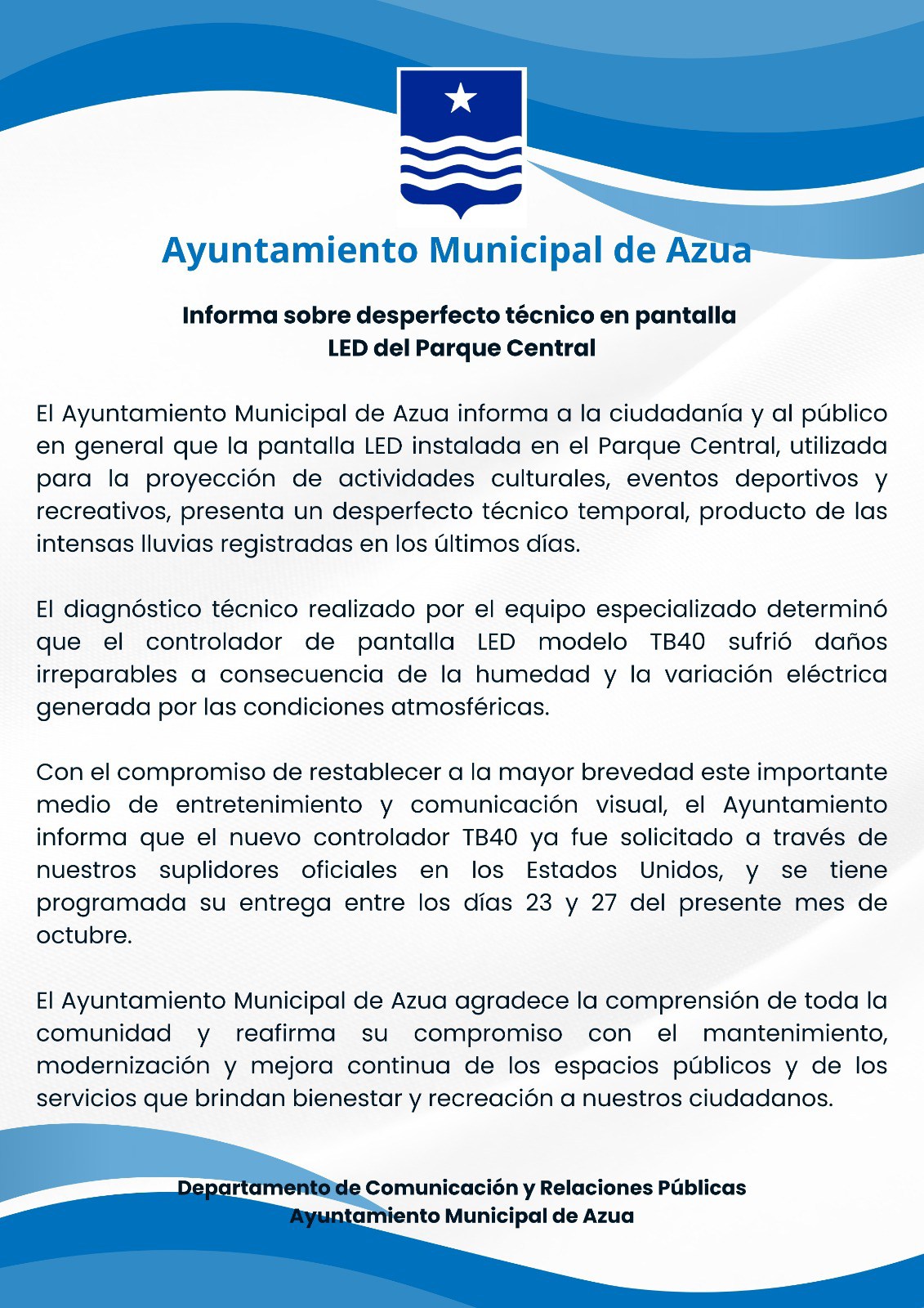 El Ayuntamiento Municipal de Azua informó este domingo que la pantalla LED gigante instalada en la entrada de la ciudad se encuentra fuera de servicio, tras sufrir una avería producto de las fuertes tormentas eléctricas y lluvias registradas en los últimos días. La institución explicó que el mal tiempo afectó directamente el sistema interno del equipo, provocando la interrupción de sus funciones habituales.